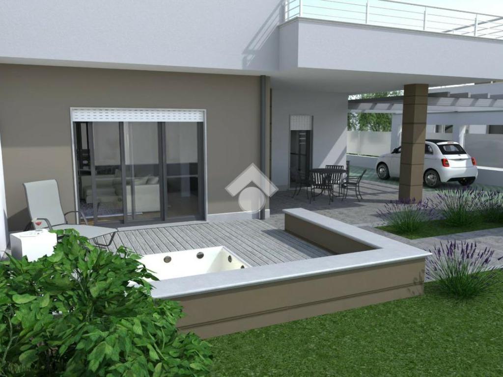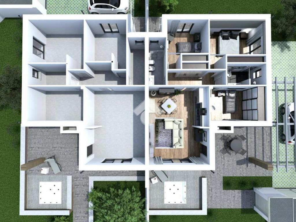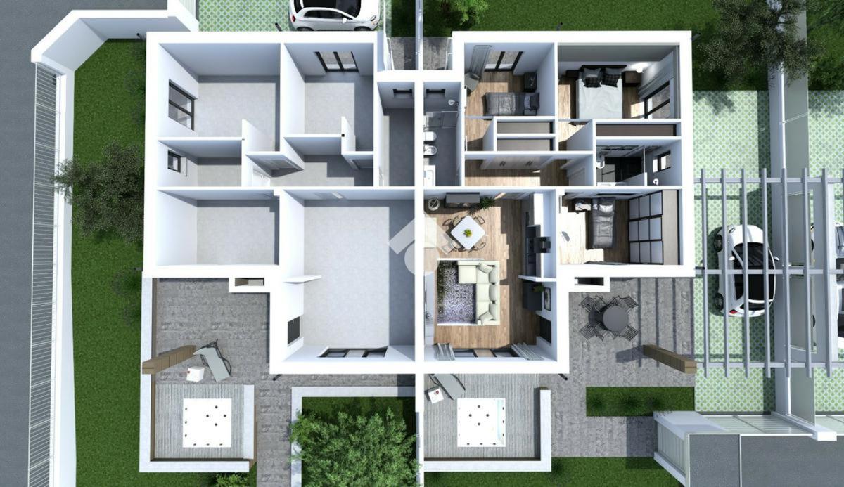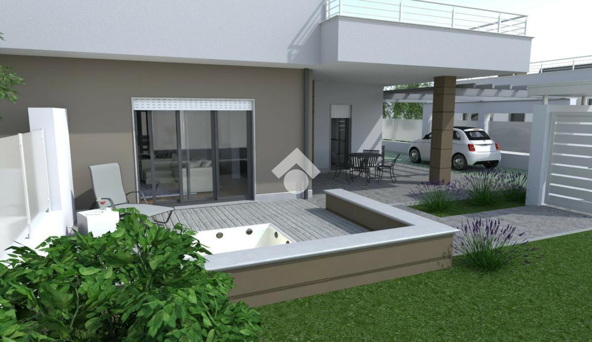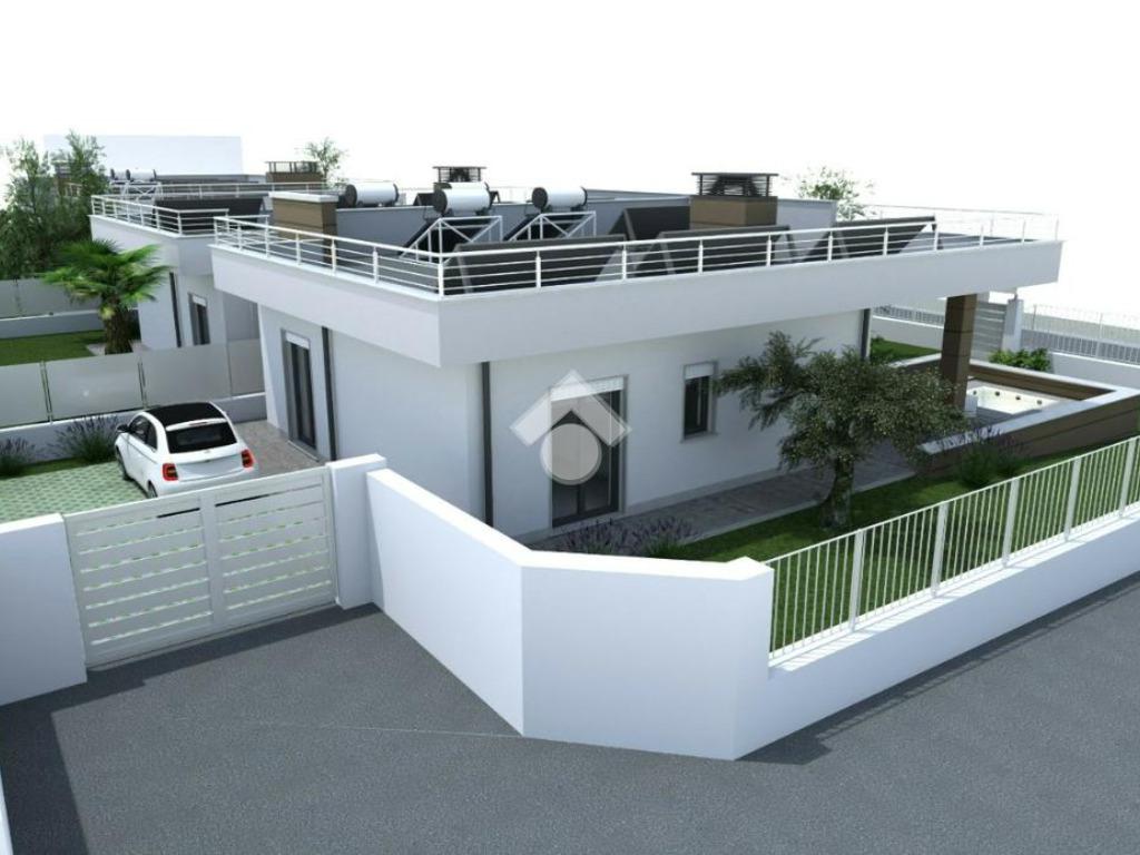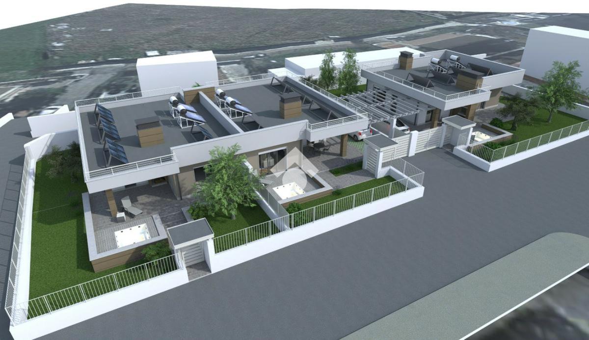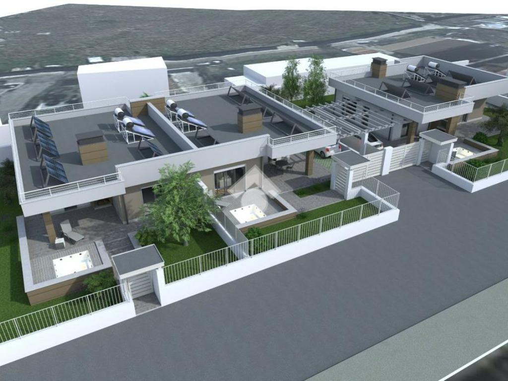 Questa nuova costruzione, situata nell'esclusiva zona di Castelverde, offre una selezione di residenze di prestigio, comprendenti due tipologie uniche: affascinanti bifamiliari e una sontuosa villa singola. Le bifamiliari accolgono con un luminoso salone che si fonde armonicamente con un moderno angolo cottura, una camera matrimoniale spaziosa e altre due stanze da letto, ognuna curata con maestria, accompagnate da due bagni impeccabilmente progettati. Ogni residenza dispone del proprio parcheggio interno, incastonato nel rigoglioso verde del giardino privato. La solidità strutturale è garantita da pilastri e travi in cemento armato, con tetto rifinito in latero-cemento, il quale, isolato con uno strato termico di 10 cm, assicura un'ottima ritenzione del calore, garantendo un comfort abitativo costante. Gli interni si distinguono per pareti interne realizzate con materiali di qualità superiore, come laterizi forati, pannello Alpha o lastre di cartongesso, garantendo non solo solidità, ma anche un efficace isolamento termico. I soffitti, elegantemente rifiniti, presentano una controsoffittatura con un ribassamento massimo di 10 cm rispetto al pavimento. I pavimenti, sia interni che esterni, sono rivestiti con pregiato gres porcellanato, garantendo resistenza e raffinatezza. Le residenze sono dotate di impianti all'avanguardia, inclusi sistemi elettrici serie Living, completi di accessori e quadro elettrico. La distribuzione di TV e internet è integrata in camere da letto, soggiorno e all'esterno, vicino al portico. L'impianto idrico sanitario, con tubazioni multistrato e accessori di qualità, garantisce un flusso d'acqua costante e affidabile. Il riscaldamento a pavimento, alimentato da caldaia a gas o pompa di calore, garantisce un comfort termico ottimale. Le residenze sono dotate di tecnologie all'avanguardia, come pannelli solari per la produzione di acqua calda sanitaria, integrati con l'impianto termico, e un impianto fotovoltaico da 3,2 kW predisposto per l'accumulo tramite batterie, garantendo efficienza energetica e risparmio. Le finiture di lusso comprendono porte interne bianche di alta qualità, porte blindate esterne e cancelli in acciaio zincato. Le finestre in PVC bianco, con varie tipologie di apertura, offrono un'eccellente illuminazione naturale. Le tapparelle motorizzate in PVC bianco e le inferriate in ferro verniciato aggiungono un tocco di eleganza e sicurezza. Gli esterni sono curati nei minimi dettagli, con finiture esterne in tinta e isolamento termico delle facciate. È prevista la predisposizione per contatori esterni, un'area verde ben curata e un camino interno, ideale per serate conviviali. L'illuminazione esterna, con lampioncini e punti luce a muro, crea un'atmosfera accogliente e suggestiva. È incluso anche il montaggio di una mini piscina per esterni, completa di motore e sistema di filtraggio dell'acqua. Questa residenza incarna l'unione perfetta tra comfort, eleganza e tecnologia, offrendo un'oasi di lusso e r
