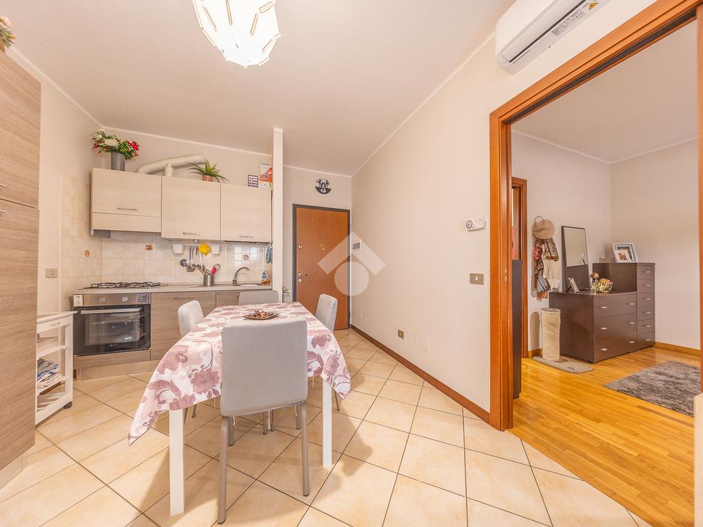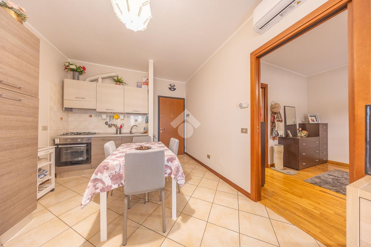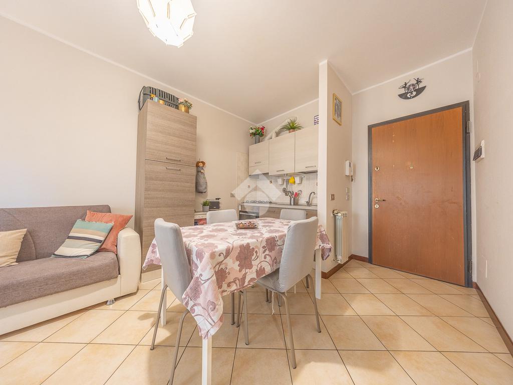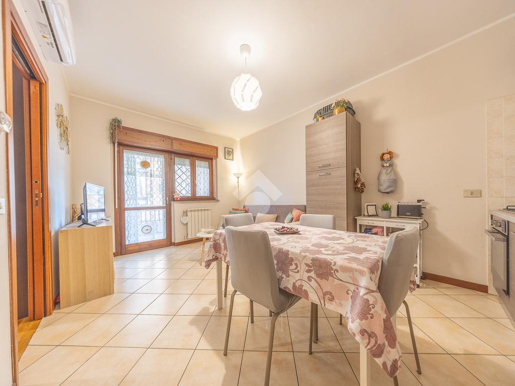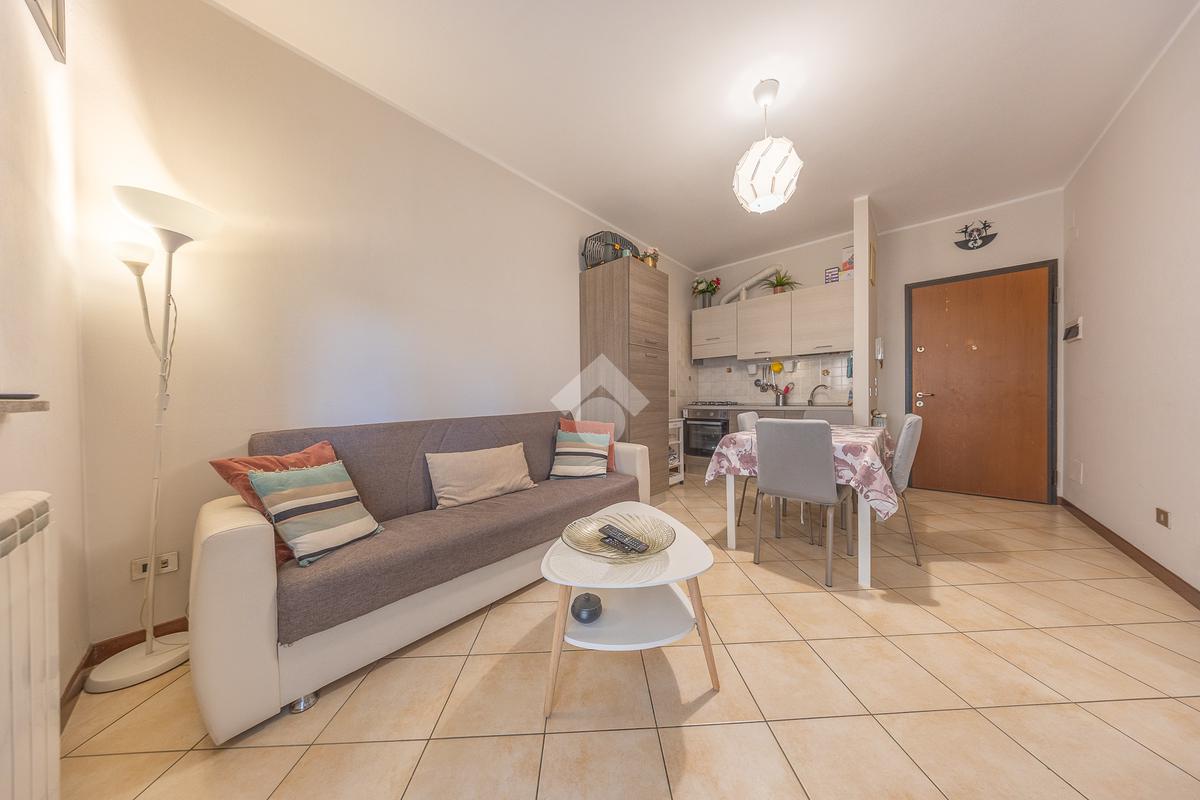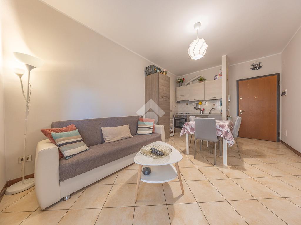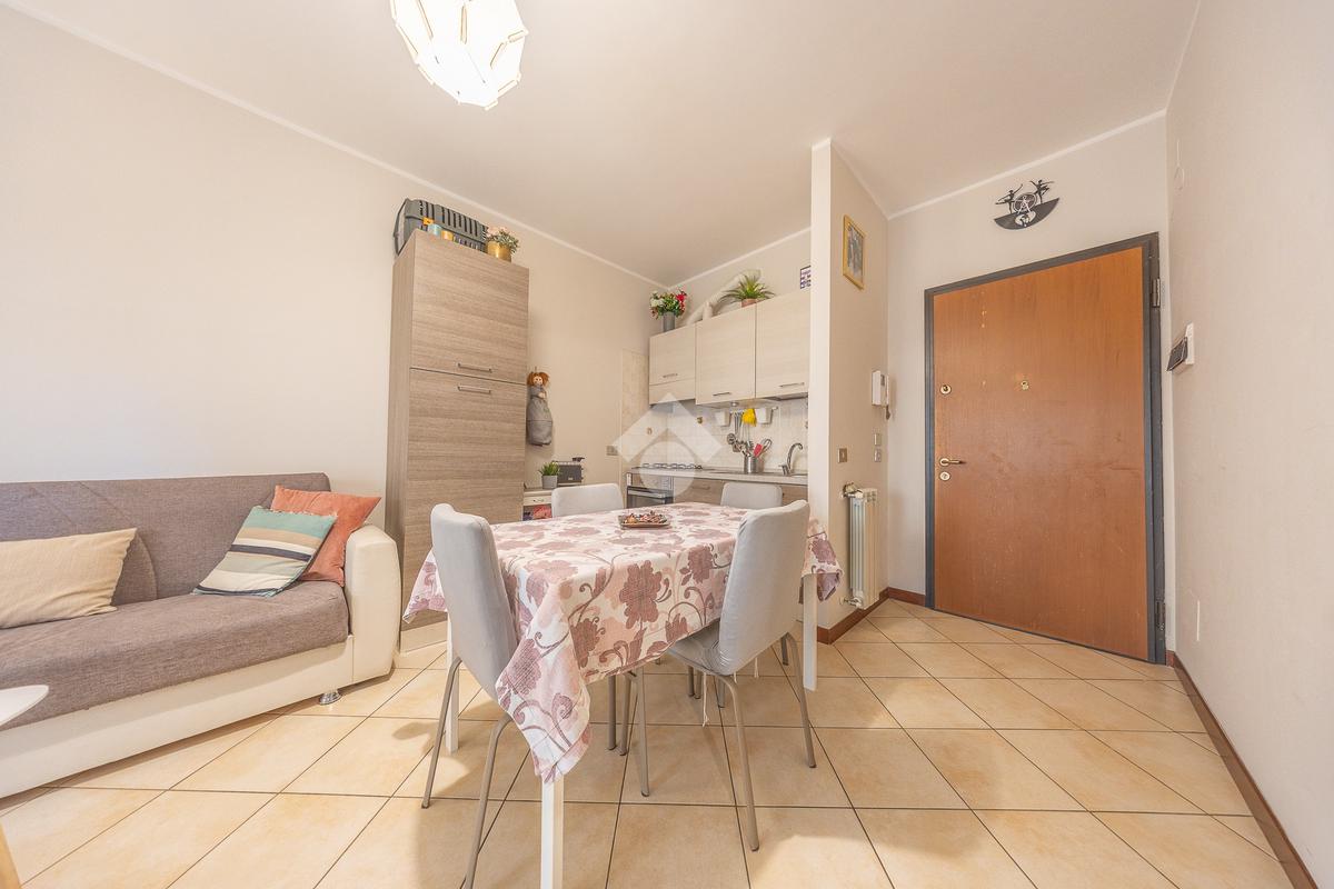 L'appartamento si apre su un accogliente soggiorno con angolo cottura, ambiente funzionale e ben distribuito, con accesso diretto al balcone, perfetto per godere di momenti all'aria aperta o per allestire una piccola zona relax.