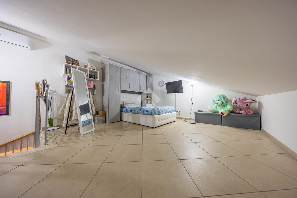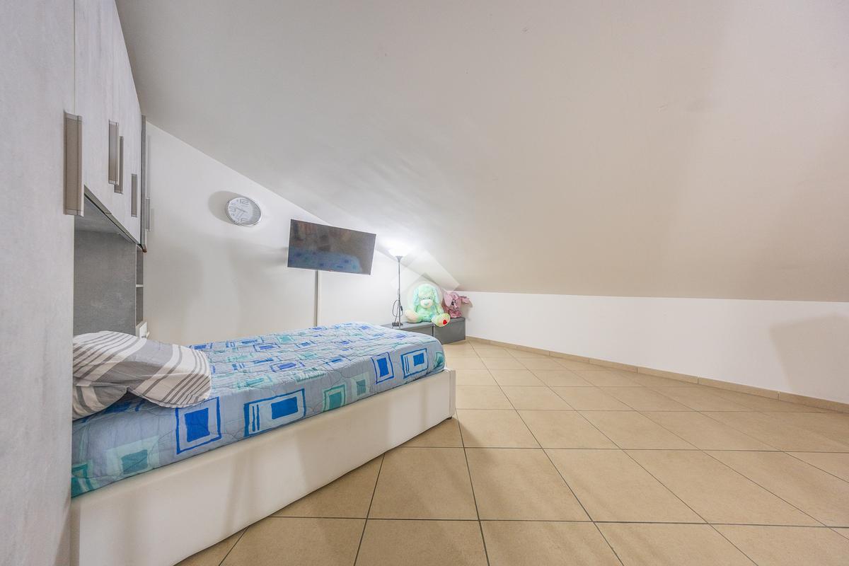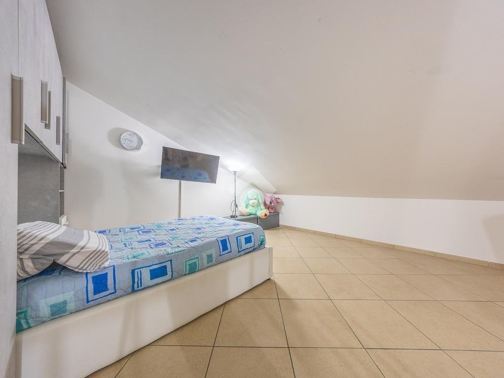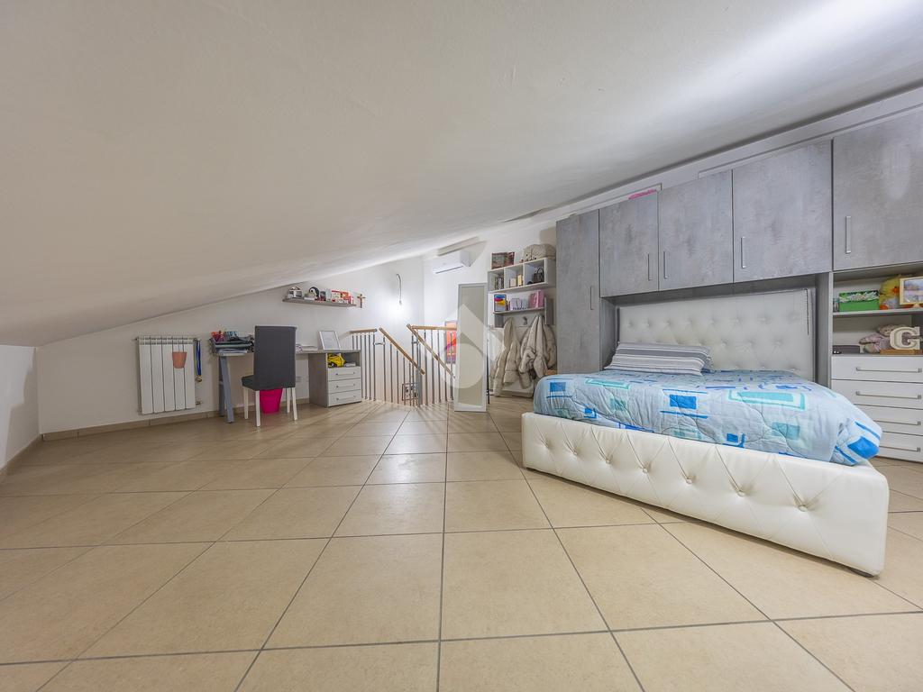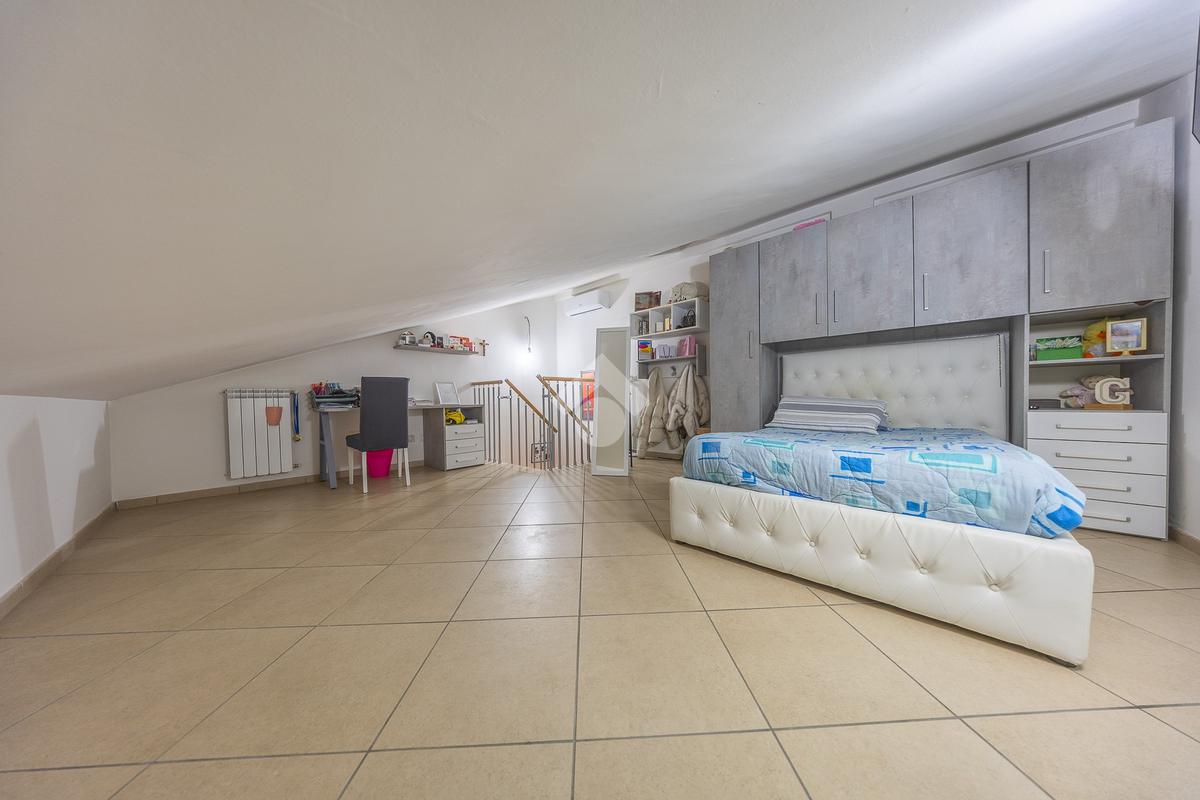 Un disimpegno accompagna alla zona notte del piano principale, dove troviamo una spaziosa camera matrimoniale e un bagno finestrato, elemento sempre molto apprezzato per la presenza di luce naturale e una migliore aerazione degli ambienti. Salendo al piano superiore si sviluppa una stanza mansardata, uno spazio versatile che può essere facilmente adattato a seconda delle esigenze, come seconda camera, studio o area dedicata agli hobby.